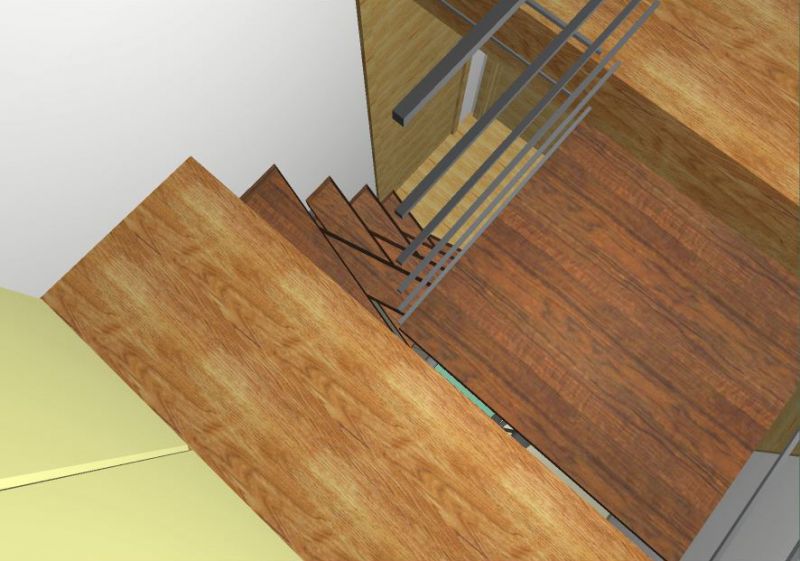 Über der ins Obergeschoss führenden Treppe wird ein Podest eingezogen, welches über eine Raumspartreppe vom Obergeschoss zu erreichen ist. Auf diesem Podest wird ein grosser Einbauschrank eingepasst, der als Archiv dienen soll. Über eine Brückenstufe gelangt man dann auf das zweite Podest, welches den Speicher erschliesst.